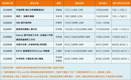 | 三、 | 辦理方式:線上遠距教學。(材料方式親取/材料部分精密儀器居多,如要郵寄請自付相關郵寄費用) |