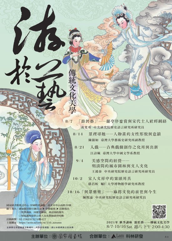 國家圖書館於 110 年 8 月 7 日至 10 月 16 日舉辦「游於藝—傳統文化美學」系列講座,歡迎踴躍參加!