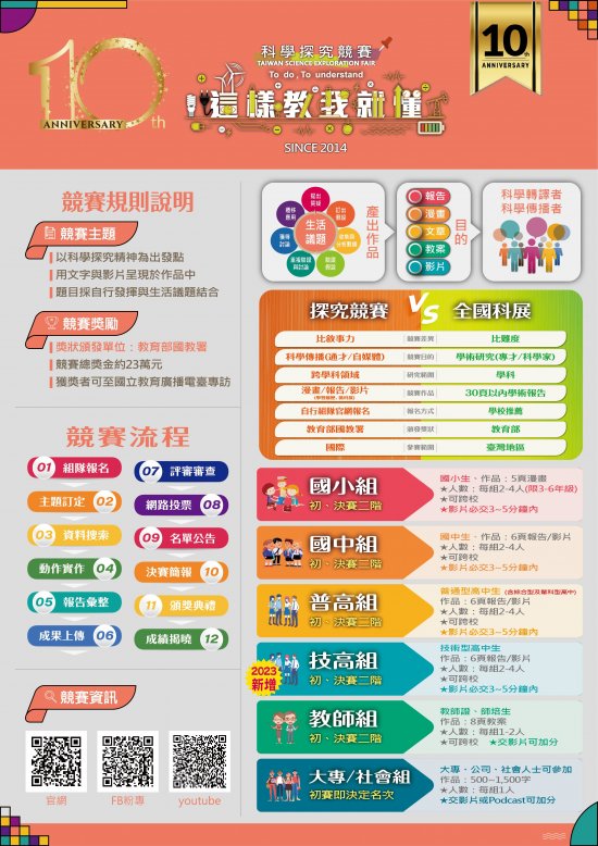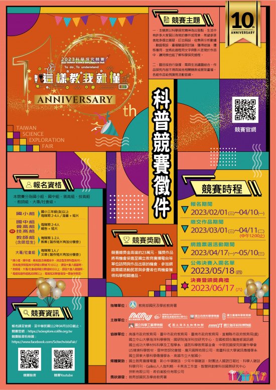 報名資訊、競賽方式與獎勵等相關資料請參閱附件或計畫網站(官網: http://sciexplore.colife.org.tw/;粉絲專頁: https://www.facebook.com/ScitechvistaFair/)。相關事宜如有疑義,請逕洽競賽承辦人施先生(電話 0988-415777 ,電子信箱:sciexplore.tw@gmail.com)。