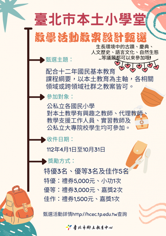 檢附「臺北市本土小學堂」教學活動教案甄選計畫、報名表、教案參考格式及宣傳海報。