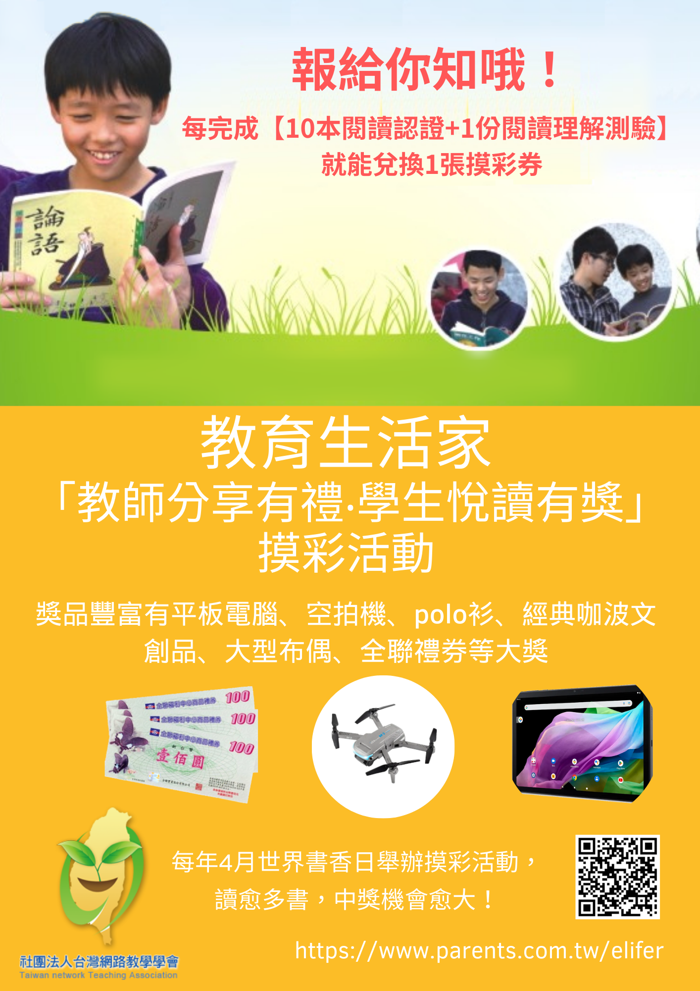 四、本會為鼓勵學生養成閱讀習慣,每年辦理三次摸彩活動: 1.世界書香日舉辦「教師分享有禮‧學生悅讀有獎」摸彩活動。 2.「閱讀深耕校園聯盟」學校的「暑假悅讀有獎」摸彩活動。 3.「閱讀深耕校園聯盟」學校的「寒假愛悅讀」摸彩活動,敬邀貴校加入聯盟 https://www.parents.com.tw/elifer/readingUnion