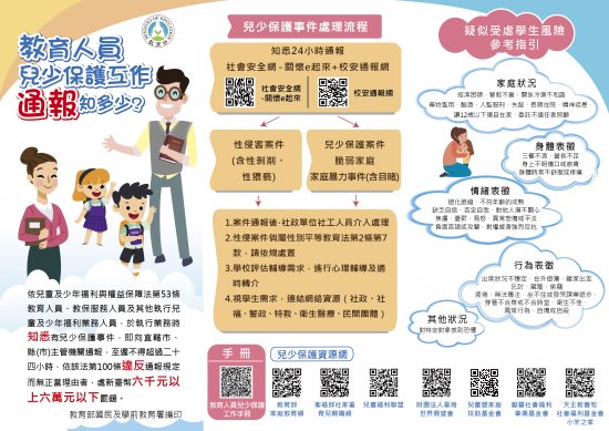 一、依據教育部國民及學前教育署 109 年 1 月 31 日臺教國署學字第 1090008179 號函辦理。 二、 為落實校園內兒少保護工作,國教署研發製作校園兒少保護宣導單張,以提供校園教育工作者相關資訊,加強對兒童虐待的覺察及處遇能力。 三、 上開宣導單張公告於國教署網站─「各類資料下載區(http://www.k12ea.gov.tw/ap/download.aspx)」,請學校自行下載運用。