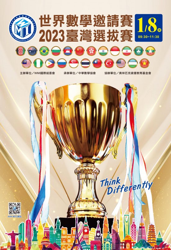 「WMI 世界數學邀請賽-2023 臺灣選拔賽」,凡就讀臺灣各縣市之公私立幼兒園至高中三年級學生之我國籍在學學生,均可報名參加,歡迎愛好數學的學生們踴躍報名,一同響應,為台灣爭取榮耀。
