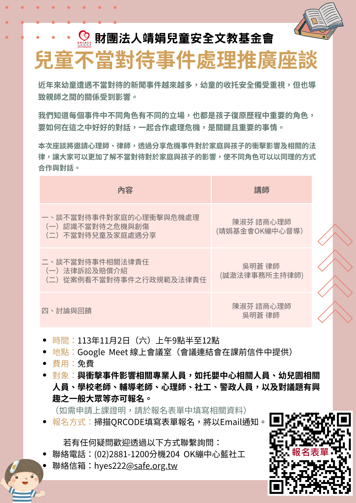 主旨: 財團法人靖娟兒童安全文教基金會 OK 繃兒童服務中心於 113 年 11 月 2 日辦理「兒童不當對待事件處理推廣座談」,鼓勵踴躍參加