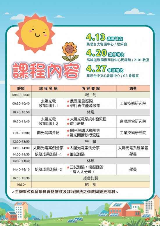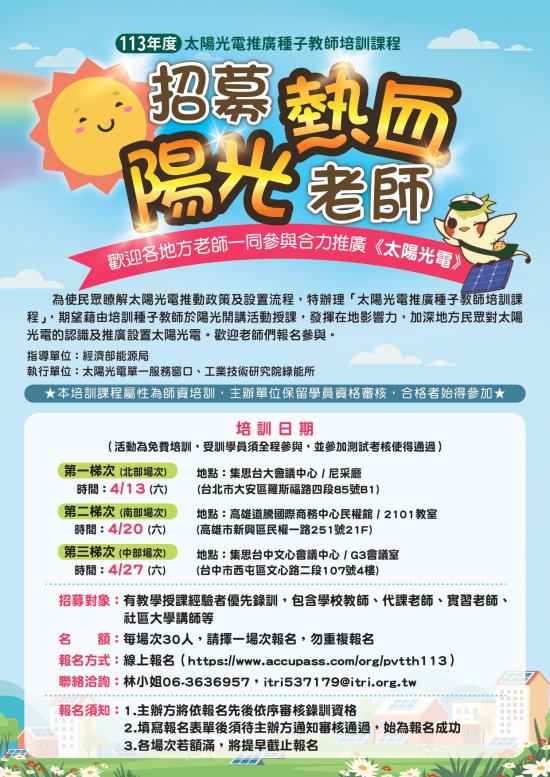 轉知財團法人工業技術研究院,鼓勵老師踴躍報名參加「113 年度太陽光電推廣種子教師培訓課程」,詳情請參考以下電子文宣。