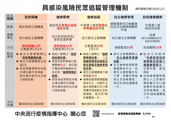 四、 檢附疫情指揮中心本年 1 月 27 日公佈之武漢肺炎「具感染風險民眾追蹤管理機制」表 1 份供參。