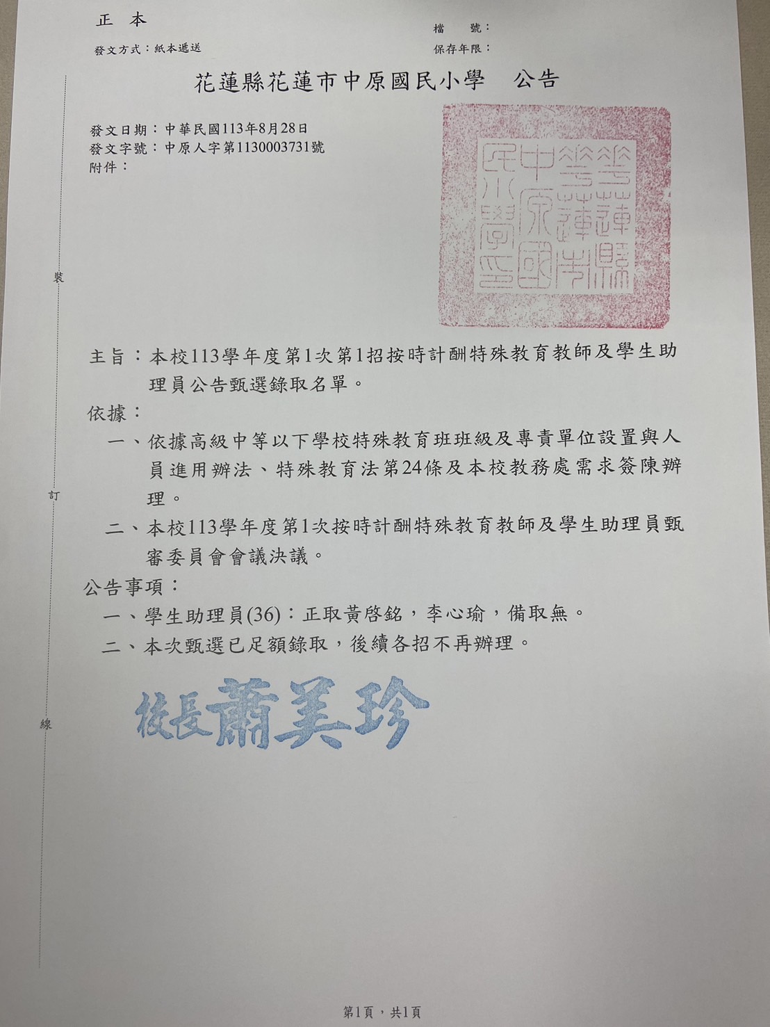 花蓮縣花蓮市中原國民小學113學年度第1次按時計酬特殊教育教師/學生助理甄選錄取公告