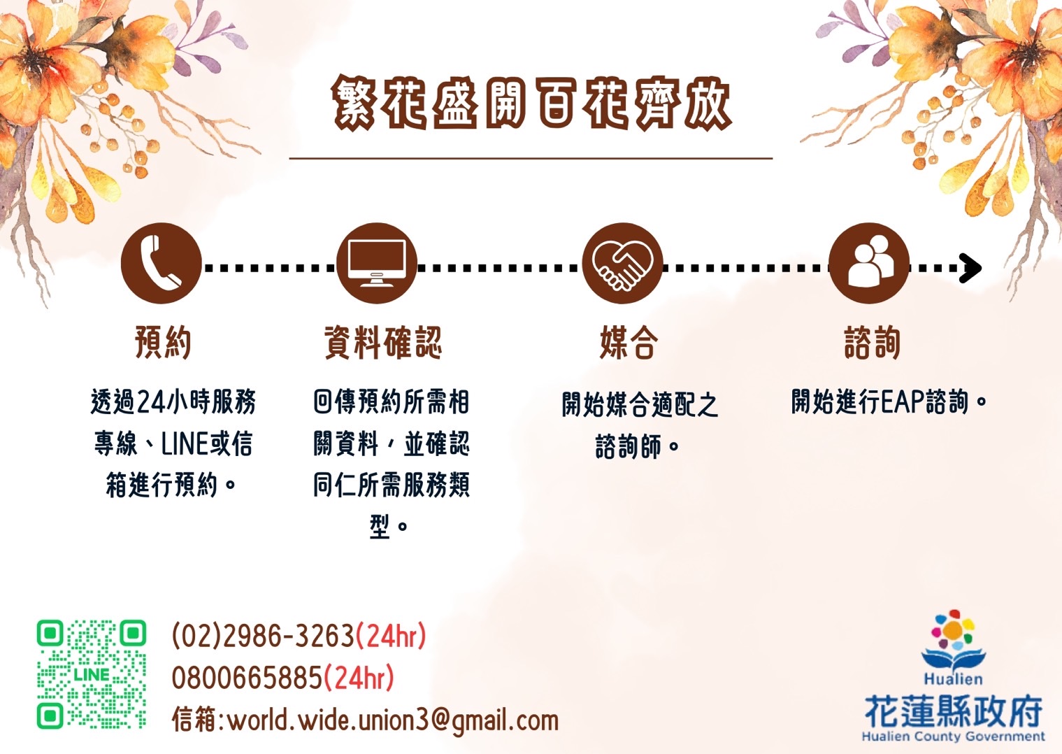 花蓮縣政府提供員工協助方案的網站及相關資料圖卡,請多加利用。https://eap.hl.gov.tw/eap/home/resouce_info.asp