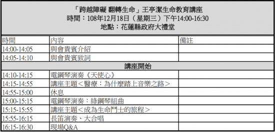 週知本府訂於108年12月18日(星期三)下午2時至4時30分,假本府大禮堂辦理「跨越障礙 翻轉生命」王亭潔生命教育講座,為鼓勵市民愛惜生命、積極向上,敬邀各單位共襄盛舉,至紉公誼。