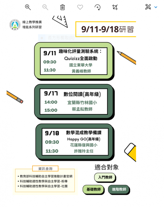 (三) 數學混成教學備課Happy GO研習時間:110年9月18日 上午9時30分至11時30分報名方式:全國教師進修網,課程代碼:3198397