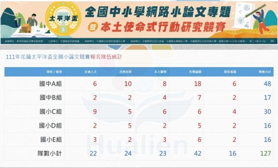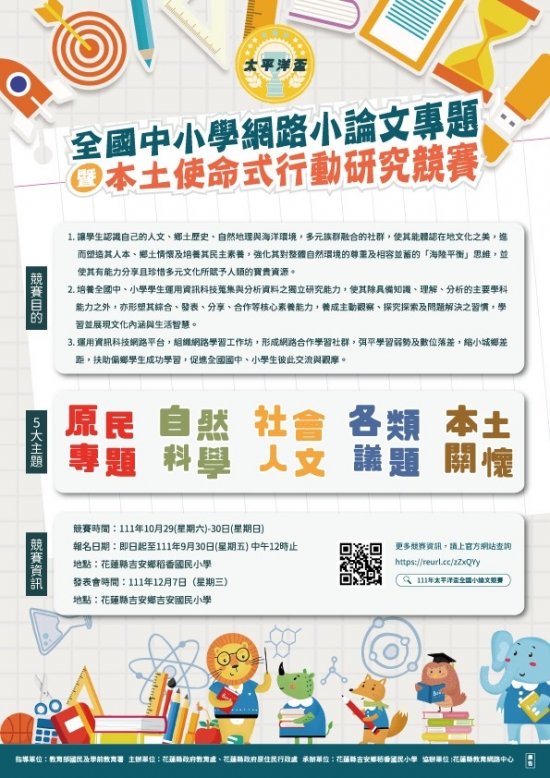 「太平洋盃 111 學年度全國中小學網路小論文專題暨本土使命式行動研究競賽」,研究相關資料請於 111 年 9 月 30 日(星期五)中午 12 時前上傳完畢,請老師們鼓勵學生踴躍報名參賽。