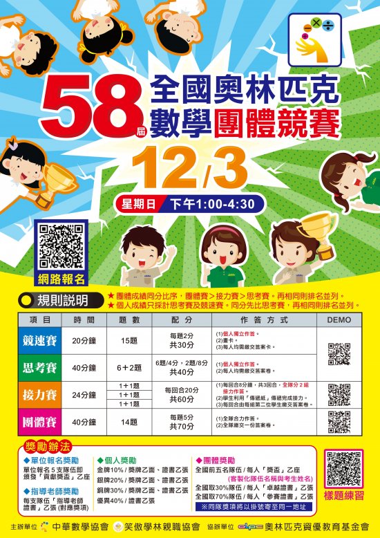 檢附「第 58 屆全國奧林匹克數學團體競賽」競賽活動簡章,供參閱。 本競賽主要目的為:開發兒童及青少年之腦力,並培養其獨立思考的能力,提升其創意思考,以培養學習數學的興趣。