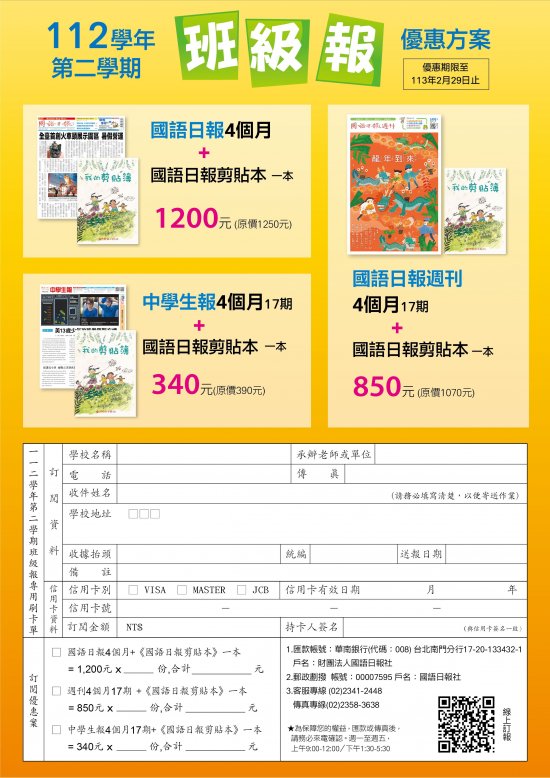 財團法人國語日報社即日起推出「112-2 學期班級報」優惠訂閱專案,此案訂閱期間為 4 個月。