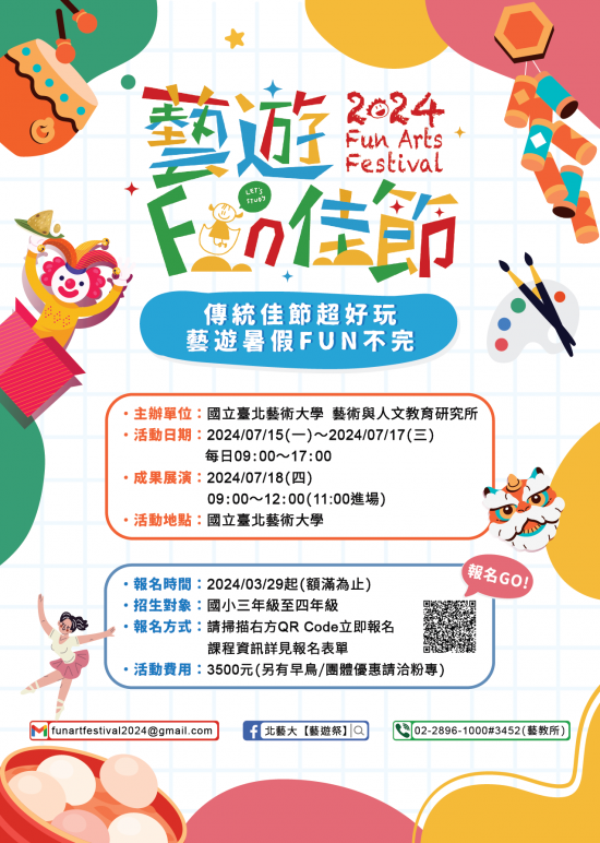 | 主旨: | 國立臺北藝術大學藝術與人文教育研究所辦理「2024 藝遊祭─藝遊 FUN 佳節」兒童藝術夏令營。 |