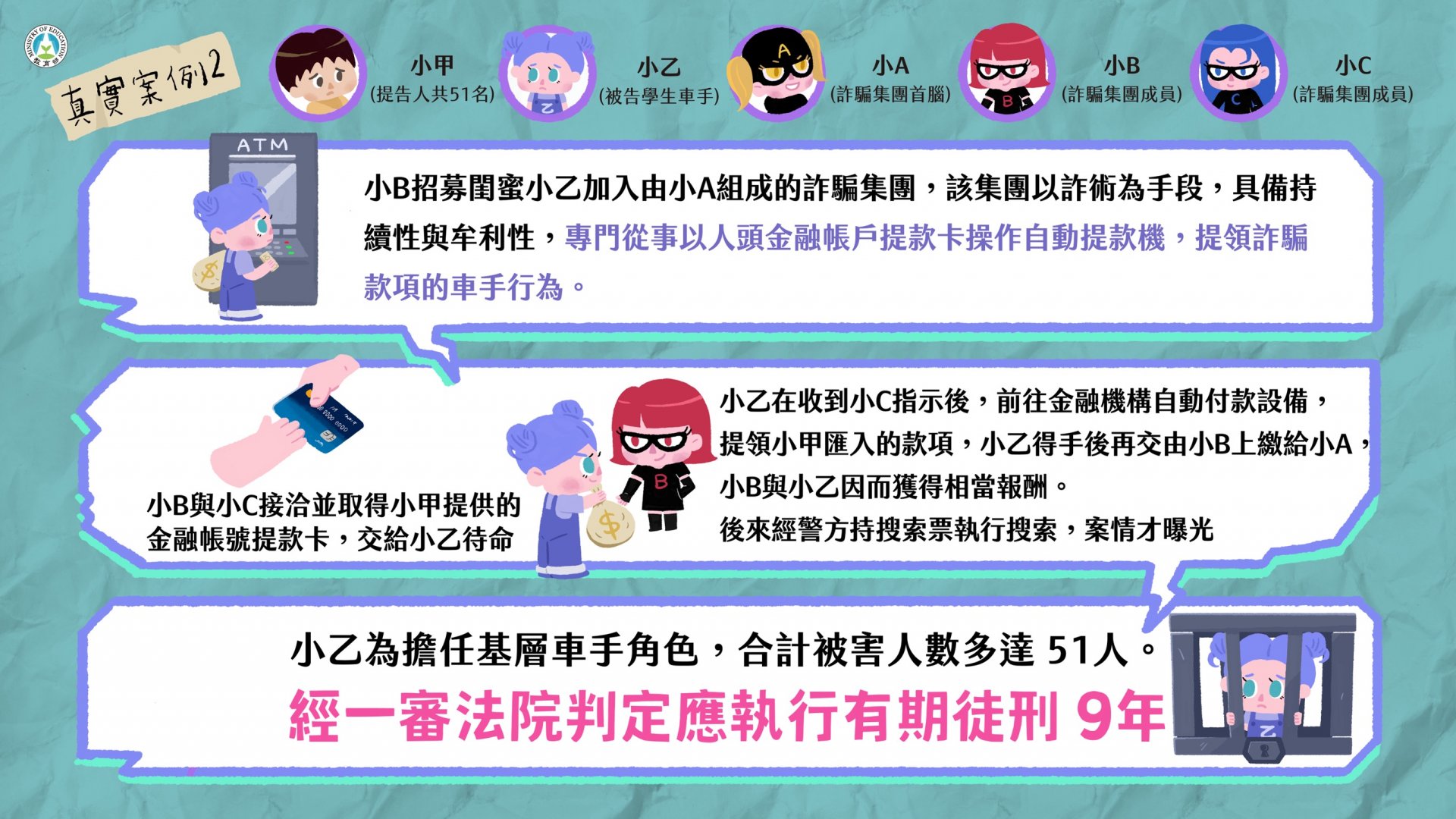 | 二、 | 近年來學生擔任車手涉詐欺案件數攀升,尤以 12 至 23 歲涉案最多,教育部藉由真實案例,解析學生擔任詐騙車手所可能承擔的法律責任,製作本案懶人包,避免學生遭不法分子利用,衍生後續的法律風險與責任。 |